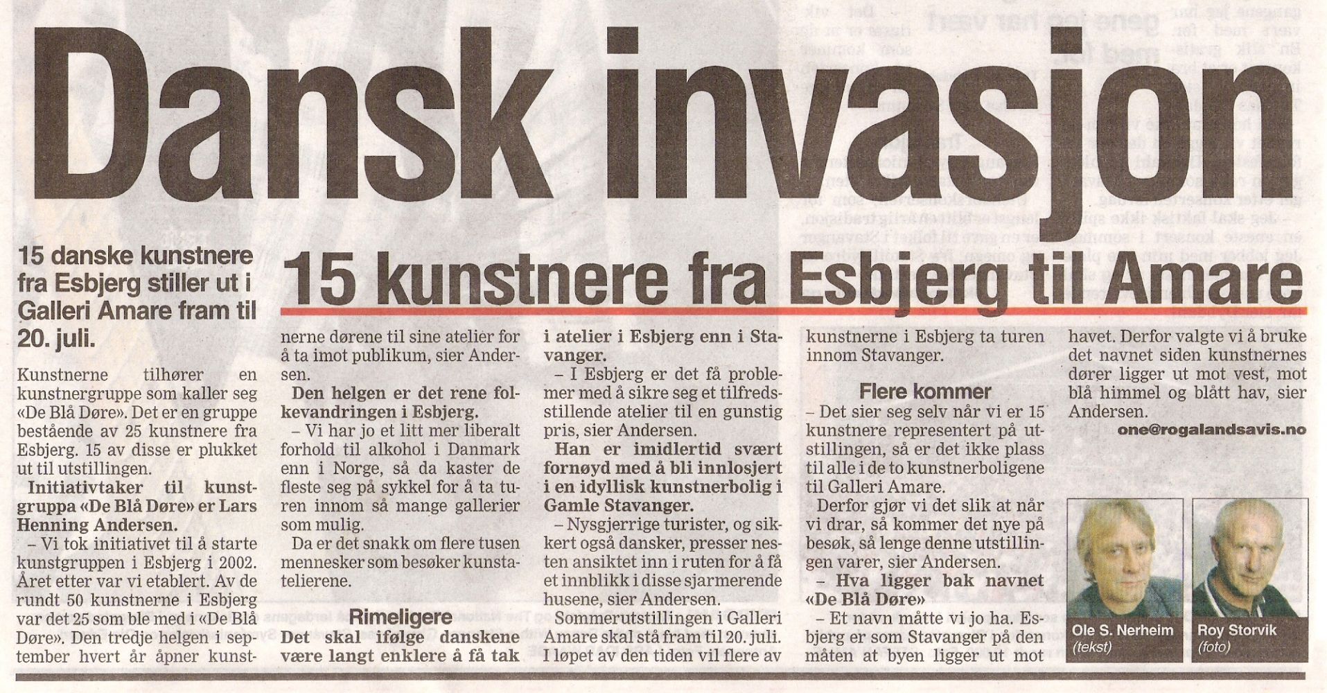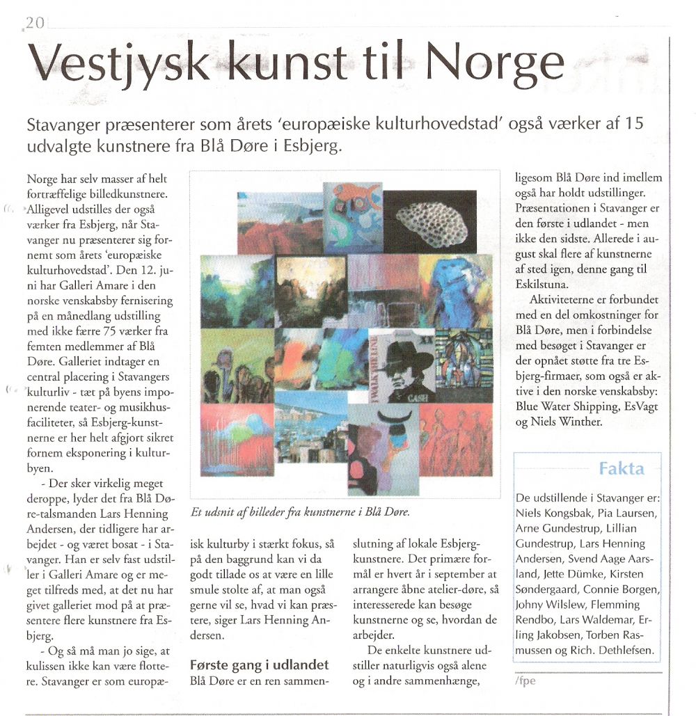 Esbjerg og Stavanger har i mange år haft et venskabsbysamarbejde og i forbindelse med at Stavanger var Europæisk Kulturhovedstad 2008 blev 15 kunstnere fra Blå Døre i Esbjerg inviteret til at at udstille i byens største kunstgalleri - Galleri Amare. Se mere på Galleri Amare