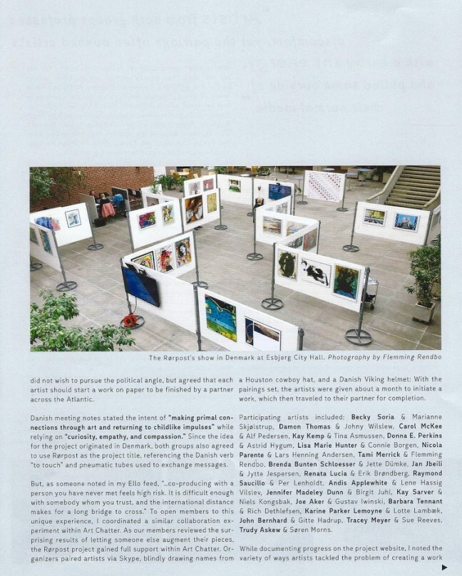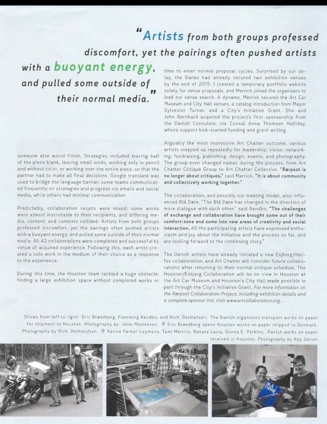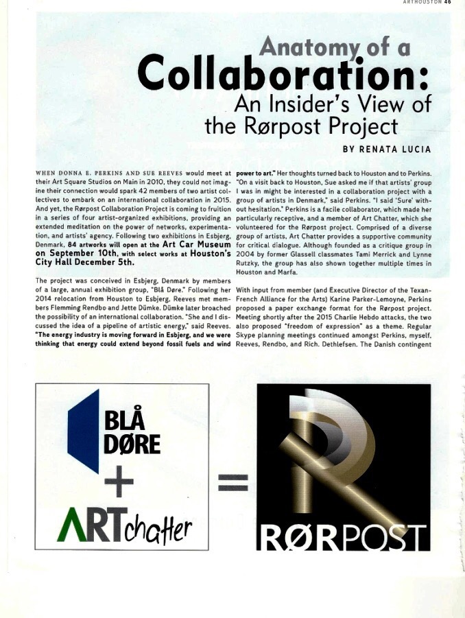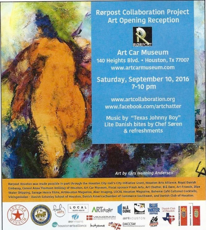 21 kunstnere fra Blå Døre har i samarbejde med 21 kunstnere fra Houston i USA udstillet egne og fællesværker på Houston ArtCar Museum og Houston City Hall samt Rådhushallen og UC Syd i Esbjerg.