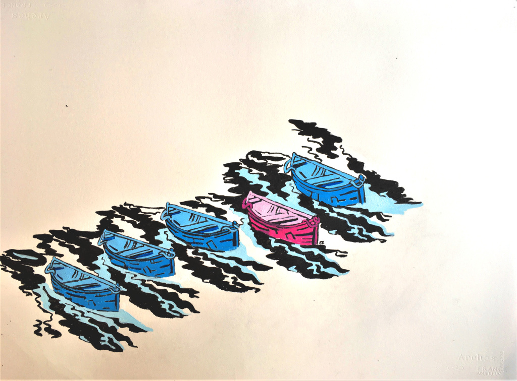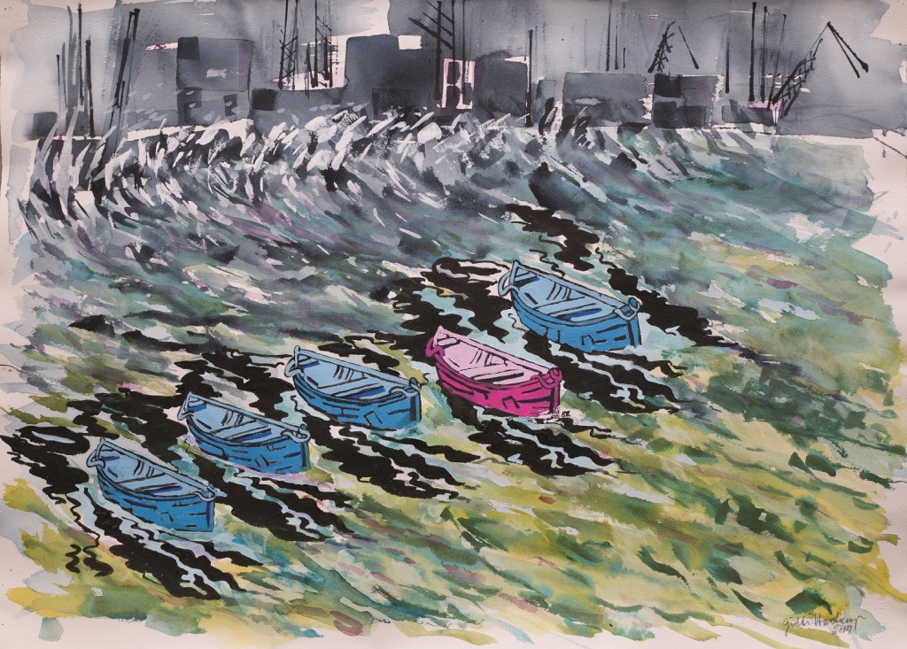 Brandt painted the boats. He was identifying to the pink boat. I held on to that, and let it reach the shore north of Esbjerg.