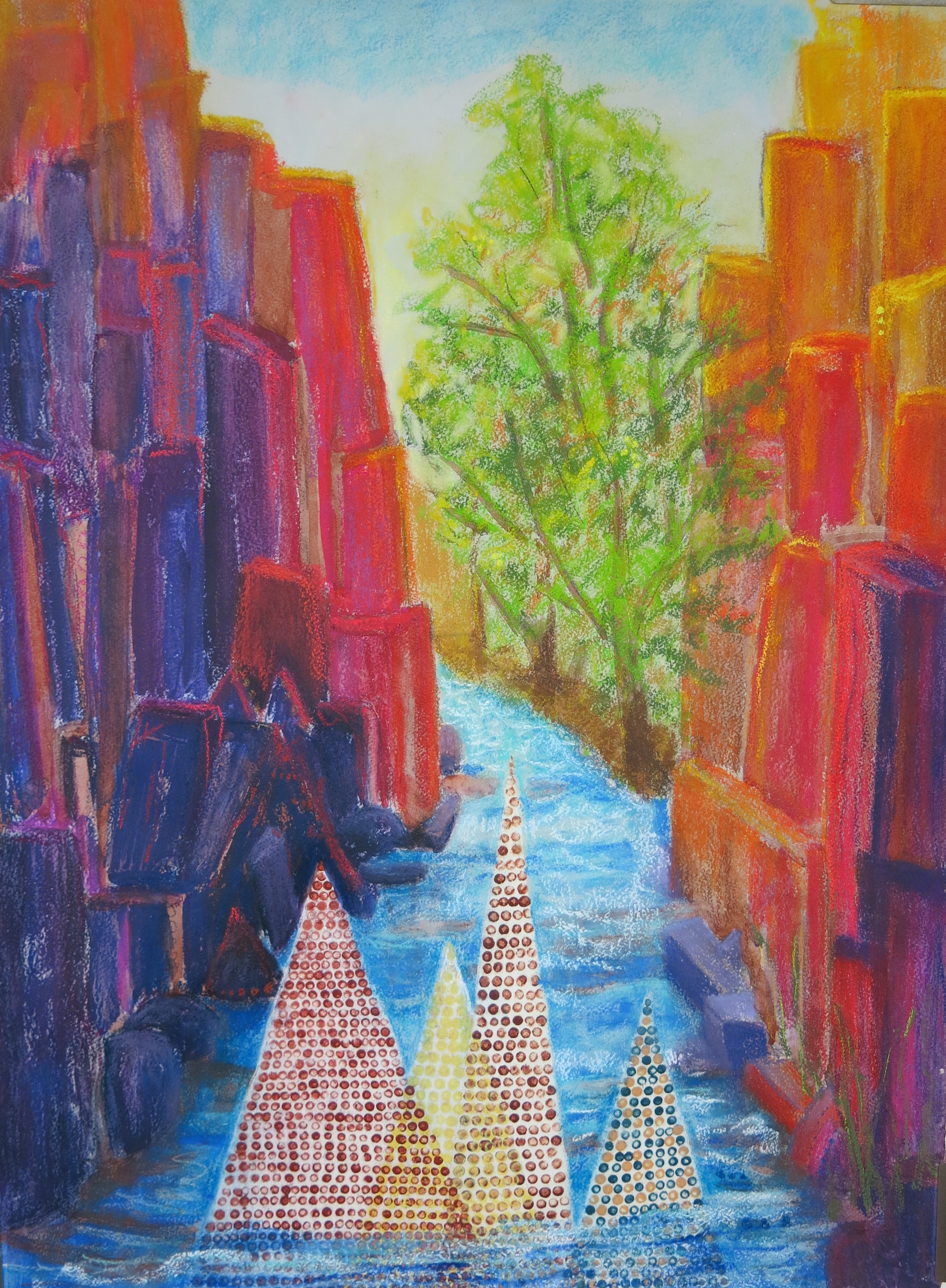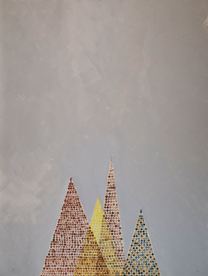 My challenge to Carol was a work in a light grey colour with four triangles of different heights, which overlap at about a third of the paper. Carol chose to integrate it into a landscape picture so that both the organic and the geometric are given space.