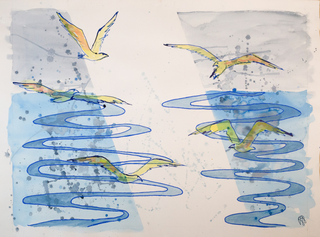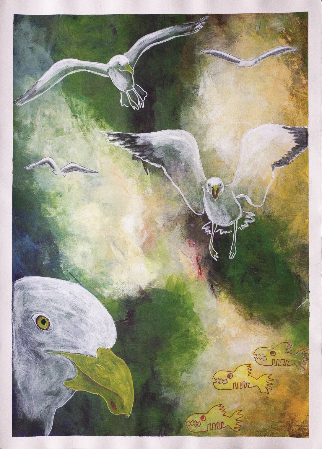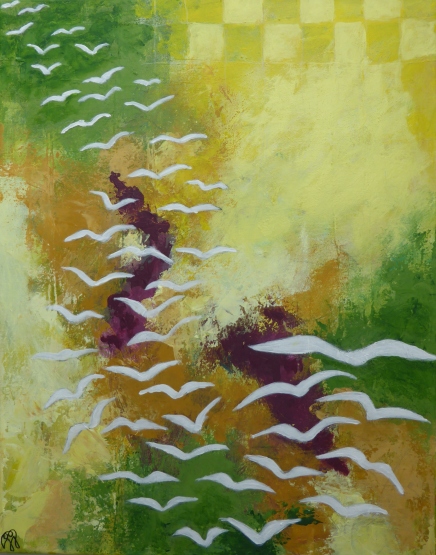So the natural choice became a landscape abstraction from the Wadden Sea, which included water and the Seagulls. Every morning and evening the Seagulls fly over my house while they scream. I like the sound.