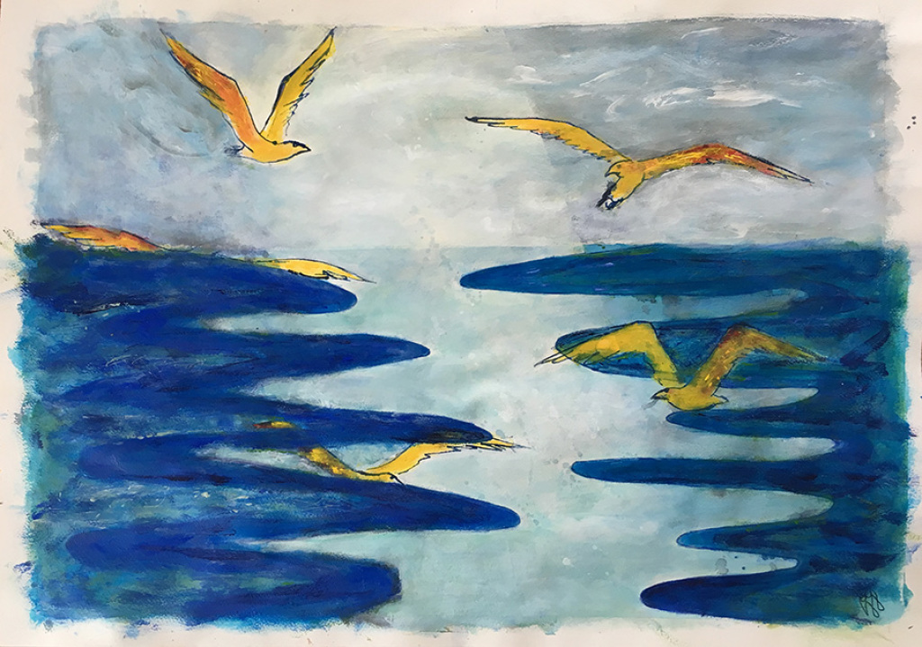 The responcework is a little slice of Cathy's picture blown up and transferred to canvas. Seagulls flying across the painting.