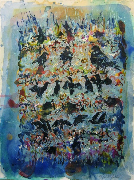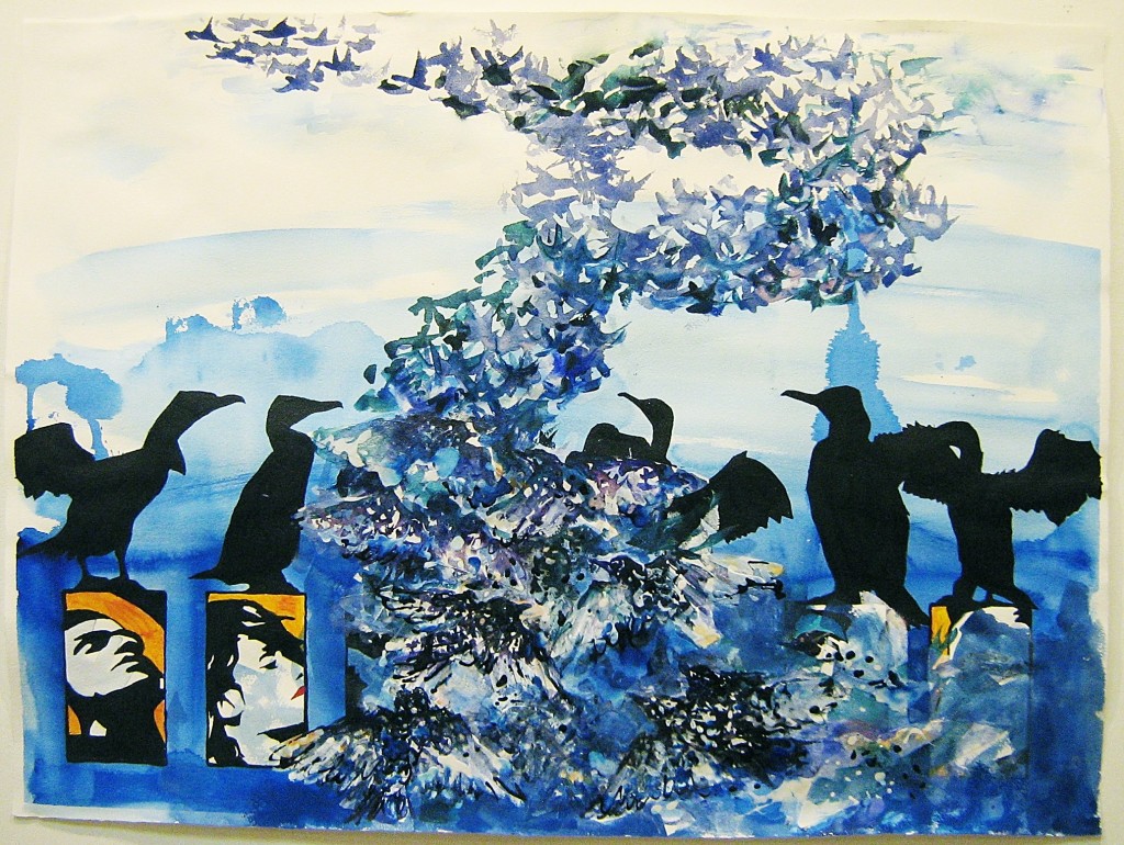 Kay Stanfield and I had a splendid dialogue and exchange of opinions. We soon found out that despite our different ways of technique and expression, collage, texture and narrative was something in common. A fascination with birds as a motif inspired us, and cormorants and starlings appeared in our works in a narrative way. Movement is also a mutual element in the end result of our individual and collective artworks. I think we were challenged and were stretched with new materials and subject matter.