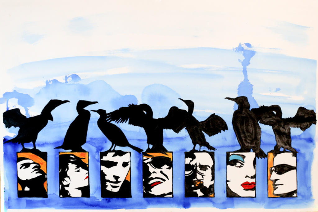 Who knew that the murmuration of starlings would provide the solution to add an organic flow to the strong graphic patterning of cormorants and faces. Starlings fly in these cloud-like formations for protective reasons and cormorants hang their wings out to dry. Both are beautiful and common to Nova Scotia and Denmark.