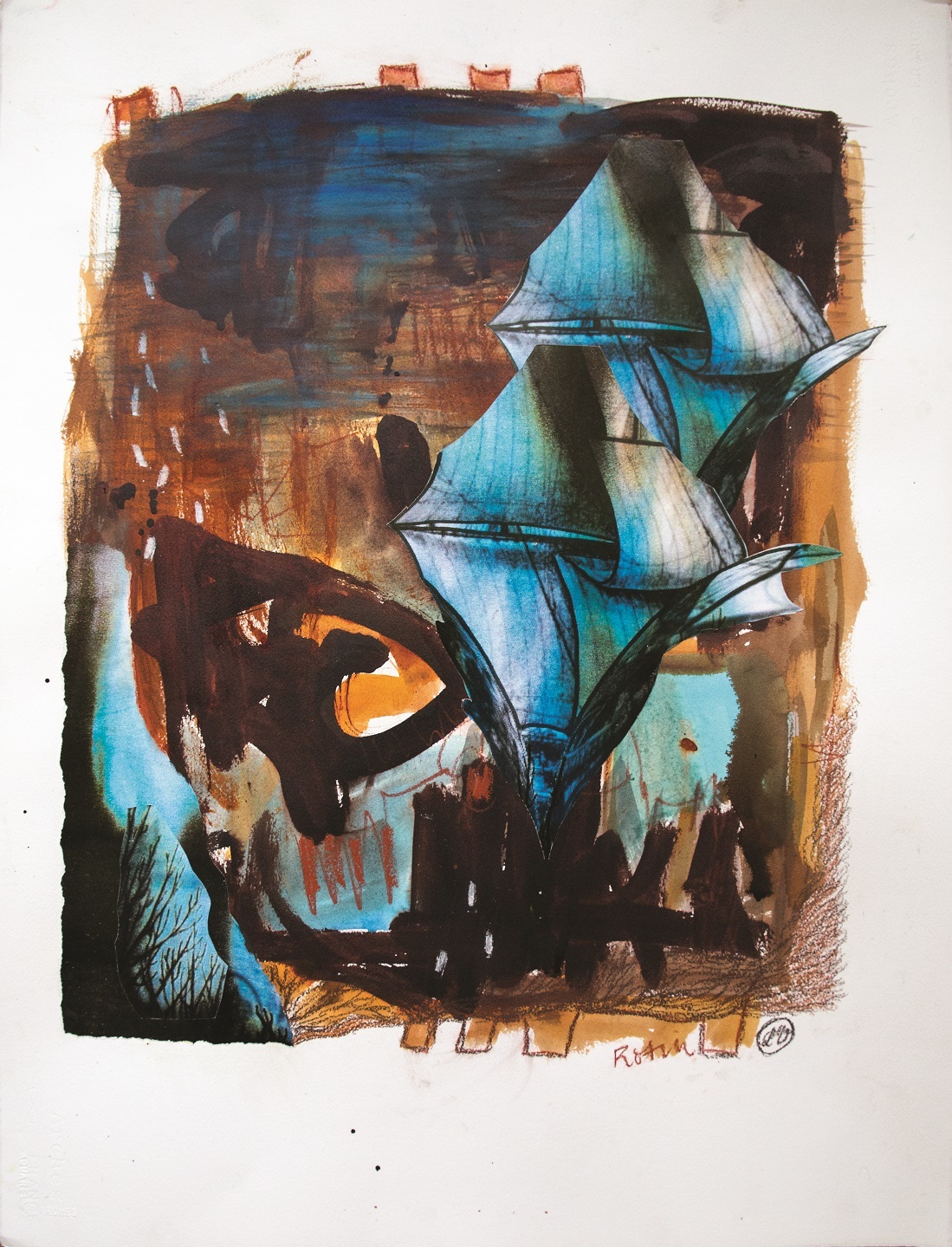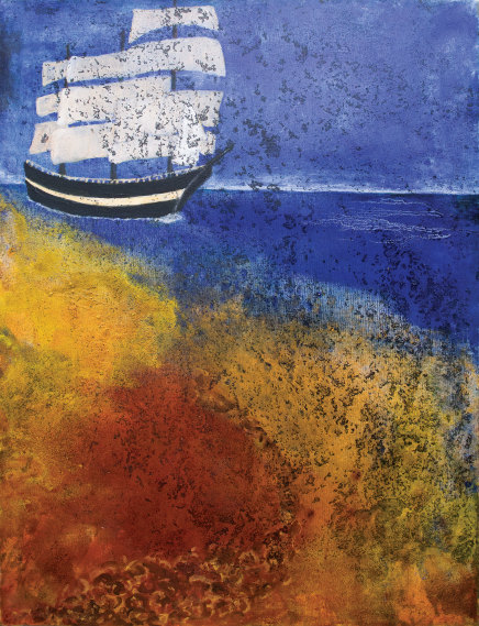 My counterpart from Halifax is Lynn Rotin. She has a very interesting spontaneous stile. I decided to use a more structured approach, then I usually have in my art. I have added 2 ships and some more blue to Lynn’s painting. I’m very fond of blue. The ships are from a poster I made for a musical concerning journeys of exploration from year 1600- 1700. Our art collaboration is too an exploration, where we get inspired of a different way of making art, and we are shipping the art pieces between us. It is a lovely sort of communication.