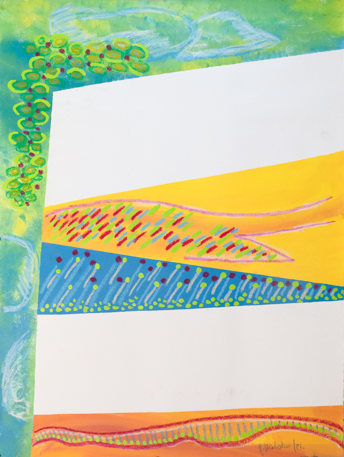 I very much liked Patricia’s first step, because she had structure in the painting and a fine pale colour scheme. I worked with her painting with great respect. She was very appreciative of what I did. I enjoy the collaboration very much!