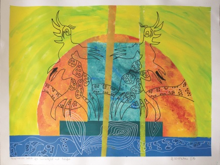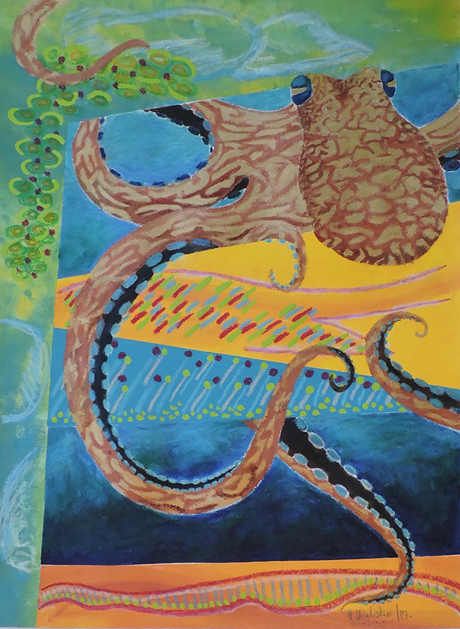 As a realist painter I have enormous respect for artists who create powerful compositions entirely from their imaginations. So taking Johny's vibrant work filled with organic and geometric forms presented me with an opportunity to move outside my comfort zone and use a new medium to insinuate one of my favourite creatures into his formal structure.