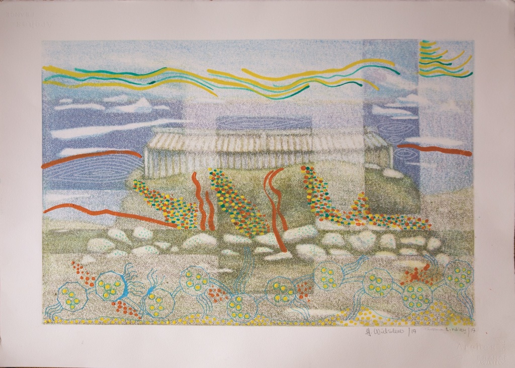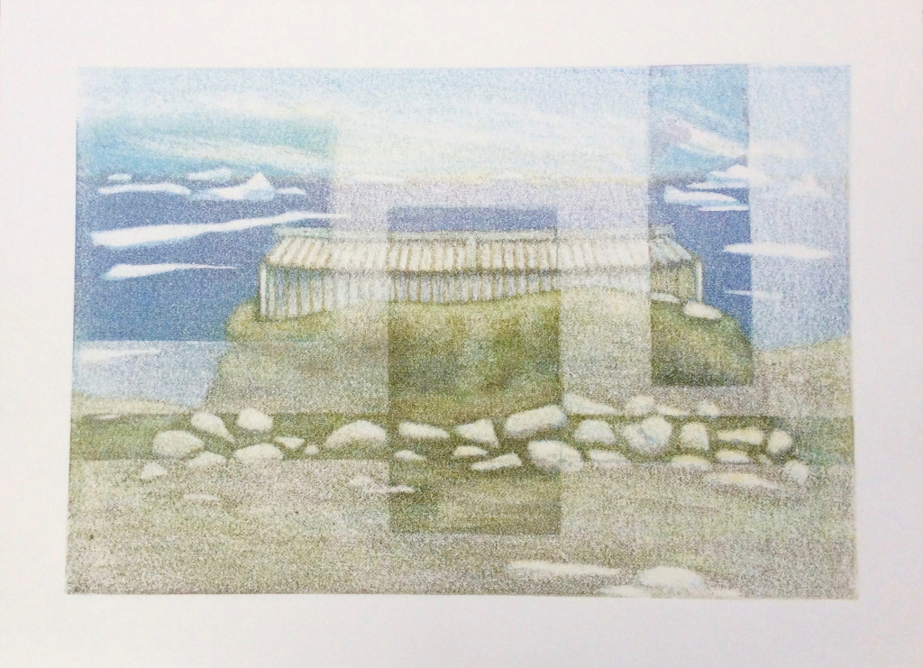 I think Johny was equally challenged by the monotype print that I chose to depict my memory of an old Inuit sod hut in Northern Greenland...the only Danish land that I have visited. I love what he did with It!