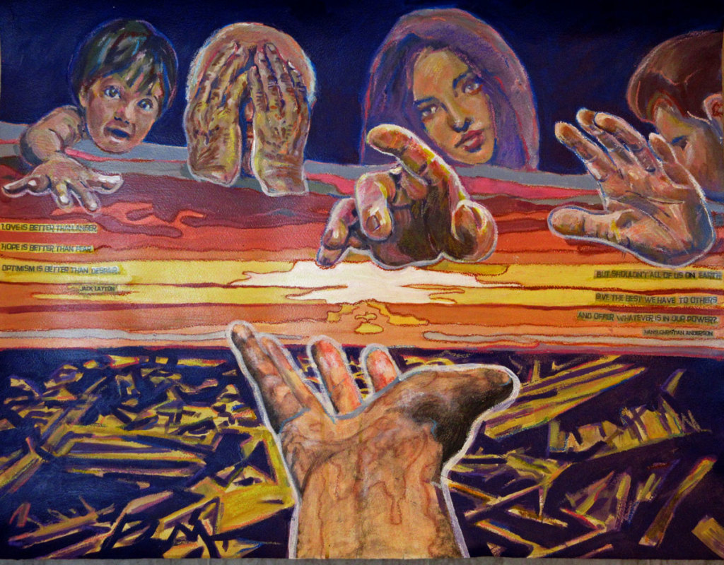 I immediately felt a sense of respect for Sue Reeves’ preliminary painting which seemed highly relevant to the world situation. I wanted to honour both political and personal responses to the outreaching hand. Do we respond with hope and love or by fear or denial? How easily it could be anyone of us as a victim of aggression in world politics. It is so easy to let fear stop us from our humanitarian nature.