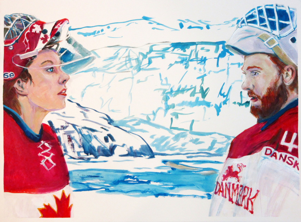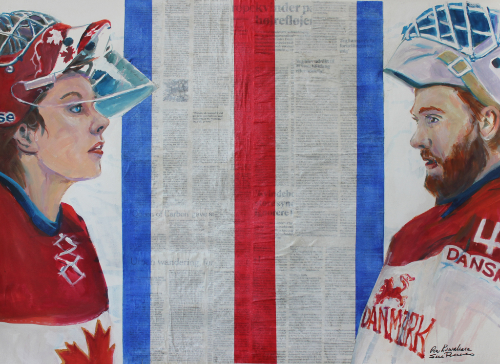 “The Neutral Zone”, my response piece, is a combination of the strong horizon, the dilemma facing women today and the polarity of opposing views. All of these concepts were questioned during my inspirational paper collaboration with Ron. “The Neutral Zone” is a metaphor that guides the composition of this piece. The wall between the canvases represents the blue line. The white stripe separates view points. It is the red line. Under the ice, under the water, under the horizon a female figure watches her back. Once she had a clear view to the horizon, now she is not so sure.