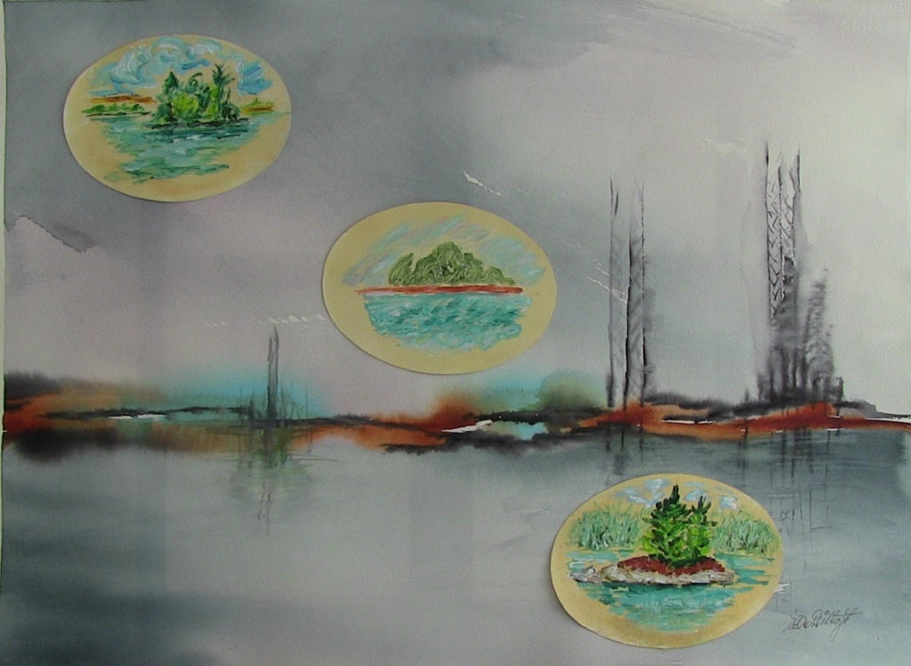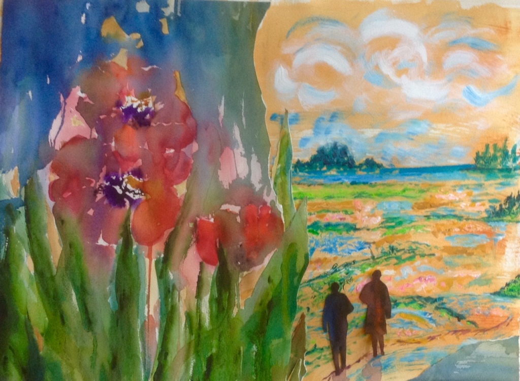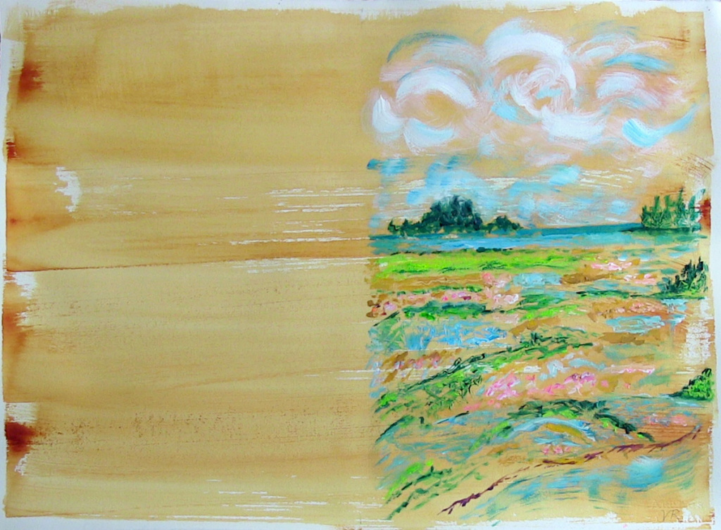 Ella and I began by showing each other images of our work. We discovered that we liked and respected each other’s art. Ella works with watercolour and paints landscapes of Denmark. Her palette is subtle and muted. I do mixed media plein air paintings in Nova Scotia as well as abstract works. I prefer brilliant colours. There has been a mutual respect shown in our collaborations with each other. In my preliminary piece, I worked with acrylics and painted the salt marsh with vibrant colours, leaving half the space for Ella who very cleverly collaged some close up bright flowers, curving slightly over my side of the painting, thus creating a dramatic sense of perspective. I have painted small collages of NS islands and placed them carefully on top of her Danish landscape, picking up on the bright colours she used where water and land meet. It has been a challenging yet interesting experience and we have gotten to know each other through our art!